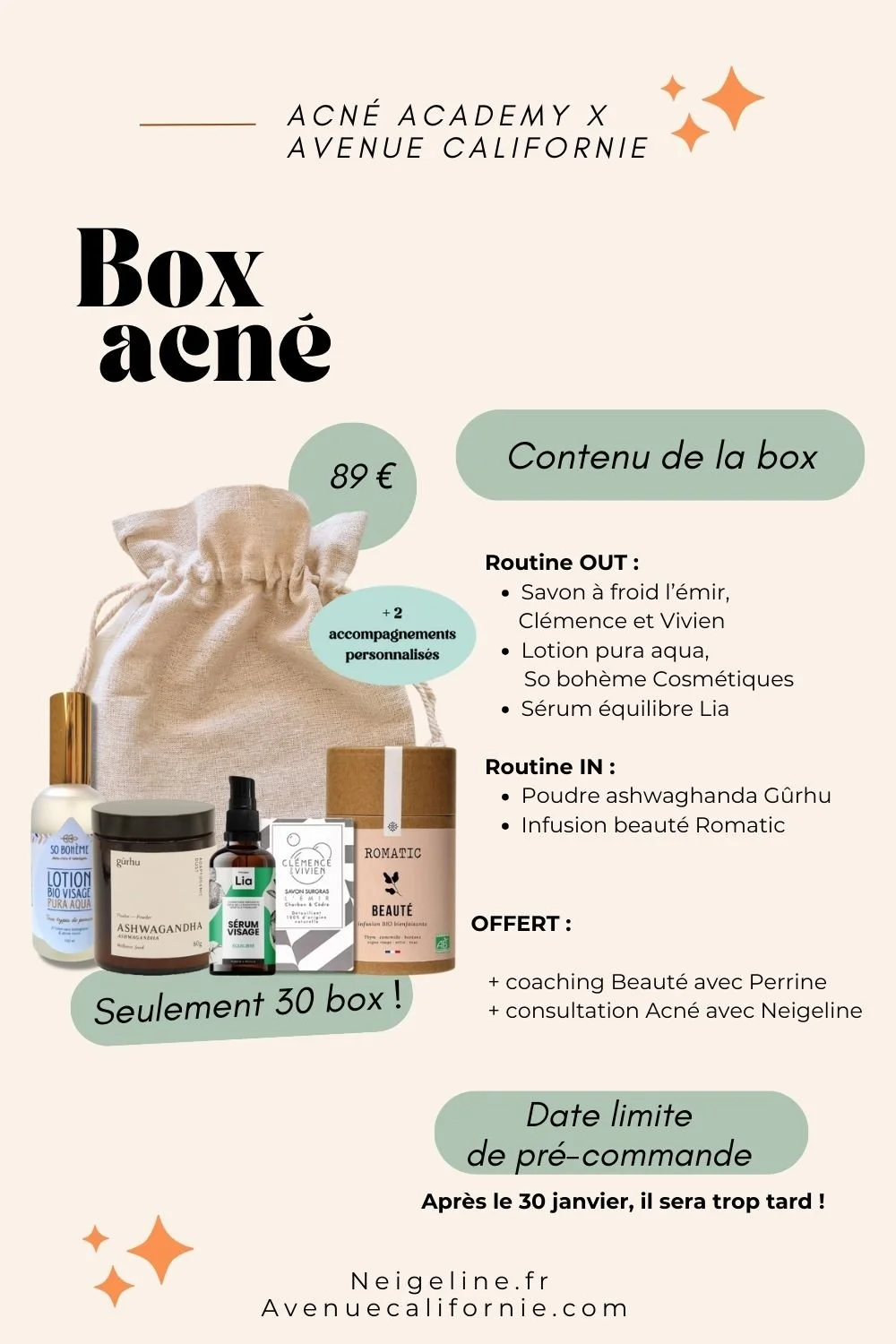 Box Acné : cosmétiques et compléments alimentaires + 2 accompagnements offerts.